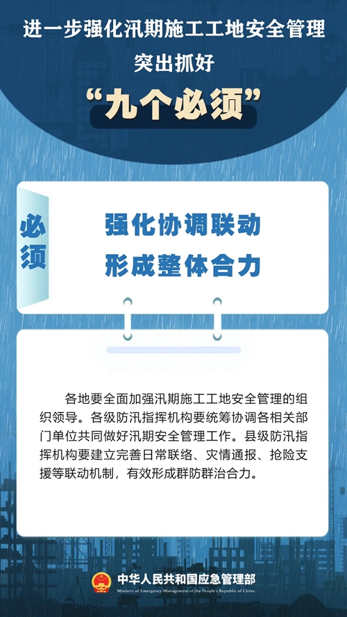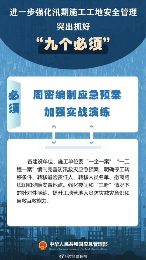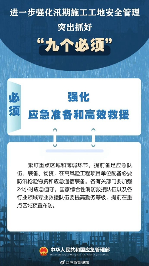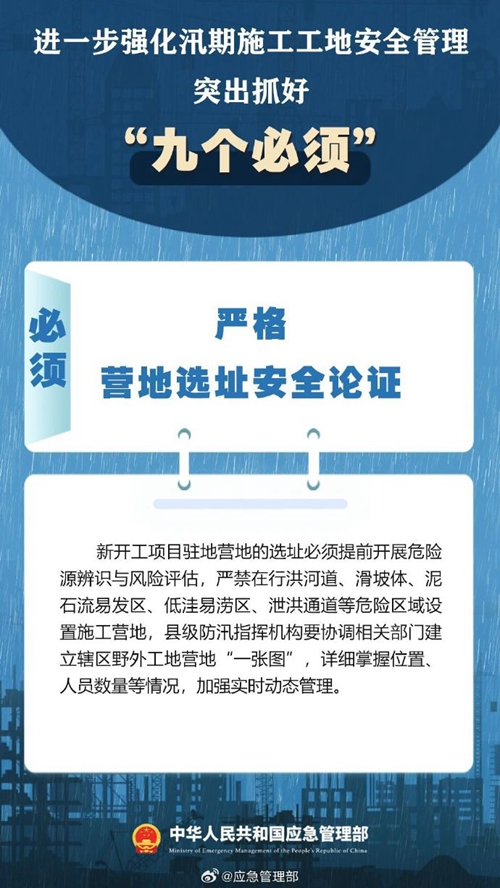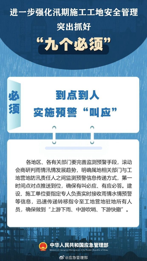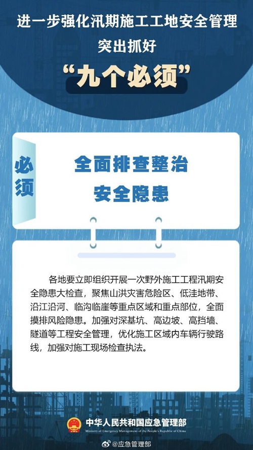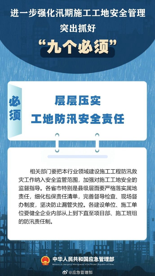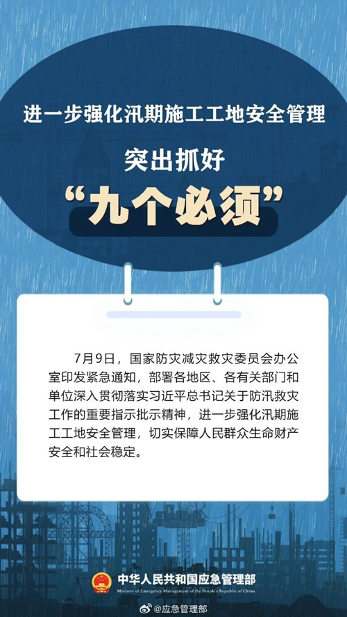 7月9日,國家防災(zāi)減災(zāi)救災(zāi)委員會辦公室印發(fā)緊急通知,進一步強化汛期施工工地安全管理,要突出抓好“九個必須”↓↓ ???