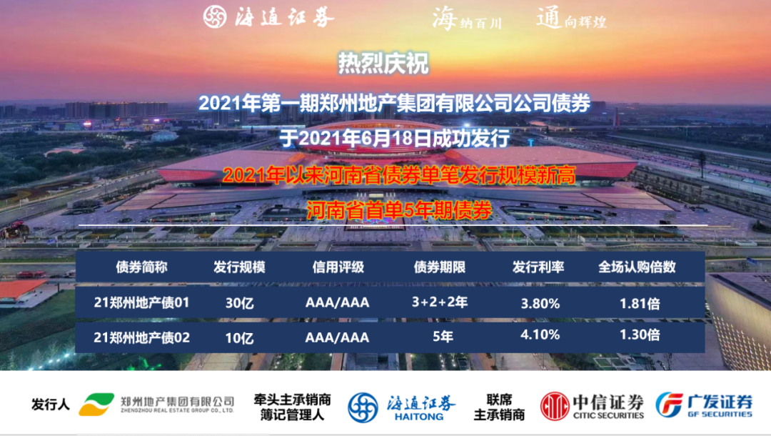 黨史學(xué)習(xí)教育在鄭州地產(chǎn)集團(tuán)如火如荼開展,集團(tuán)黨委在鄭州市委、市政府的領(lǐng)導(dǎo)下,在鄭州市國資委黨委的監(jiān)管下,在學(xué)黨史、悟初心的基礎(chǔ)上,將“辦實事、解難題”作為黨史學(xué)習(xí)教育的重要內(nèi)容,充分釋放黨建紅色生產(chǎn)力,推進(jìn)黨史教育深入業(yè)務(wù)實踐,引領(lǐng)業(yè)務(wù)高質(zhì)量發(fā)展。在集團(tuán)黨委的堅強領(lǐng)導(dǎo)下,鄭州地產(chǎn)集團(tuán)6月18日成功發(fā)行第一期優(yōu)質(zhì)企業(yè)債券40億元,3+2+2年期產(chǎn)品發(fā)行利率3.8%,5年期產(chǎn)品發(fā)行利率4.1%。本次發(fā)行創(chuàng)河南省首單5年期企業(yè)債券,創(chuàng)2021年以來河南省債券單筆發(fā)行規(guī)模新高,是鄭州地產(chǎn)集團(tuán)資本市場融資工具的又一創(chuàng)新探索!