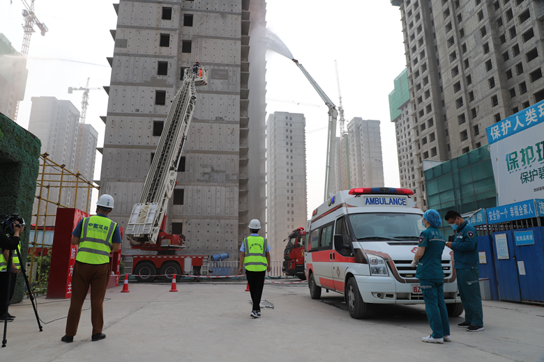 啟動儀式上,在工地現(xiàn)場開展了消防救援應(yīng)急演練。該環(huán)節(jié)模擬施工現(xiàn)場發(fā)生火災(zāi)時,現(xiàn)場管理人員應(yīng)急操作反應(yīng)及配合市消防救援支隊展開滅火救援的案例。演練現(xiàn)場火災(zāi)模擬真實生動,4部消防車、1部救援車、1部救護(hù)車實地奔赴現(xiàn)場開展滅火及救援。整個演練過程現(xiàn)場組織嚴(yán)密、人員到位快速、操作程序得當(dāng),達(dá)到了預(yù)期效果。宣誓環(huán)節(jié),由中建二局三公司代表引領(lǐng)各參賽單位代表共同開展安全宣誓。趙新中為各參賽單位授旗。